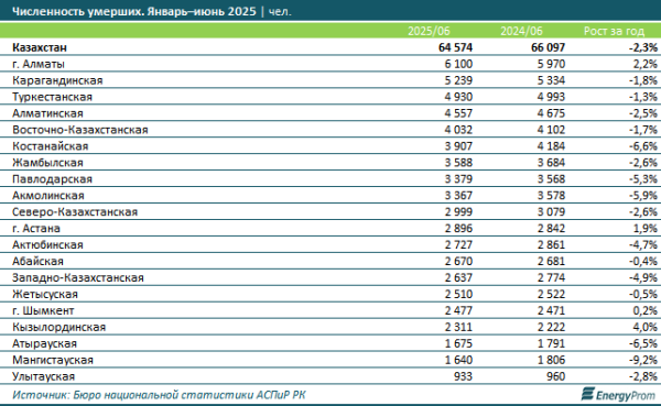 В региональном разрезе наибольшая численность умерших пришлась на Алматы (6,1 тыс. человек), а также Карагандинскую (5,2 тыс. человек) и Туркестанскую (4,9 тыс. человек) области, наименьшая — на Улытаускую (933 человека), Мангистаускую (1,6 тыс. человек) и Атыраускую (1,7 тыс. человек) области.
