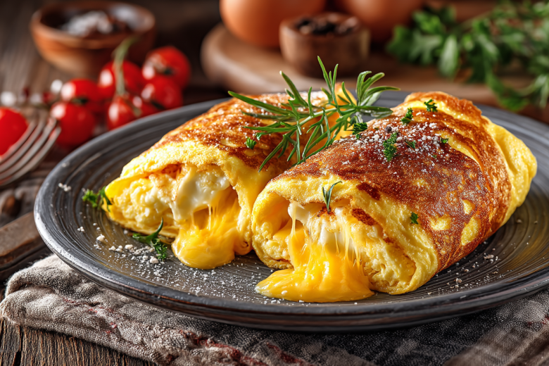 Рецепт: яйца взбейте с молоком и солью до лёгкой однородности. Сыр натрите на крупной терке. Разогрейте сковороду на среднем огне, смажьте маслом. Вылейте яичную смесь и жарьте омлет под крышкой 2-3 минуты, пока верх почти не схватится, а низ не подрумянится. На половину омлета выложите тертый сыр. Лопаткой аккуратно приподнимите вторую половину и накройте ей сыр, формируя полумесяц. Затем заверните края, чтобы получился аккуратный конвертик. Прогрейте конвертик с каждой стороны ещё по 30 секунд, чтобы сыр полностью расплавился. Подавайте горячим, посыпав зеленью.
