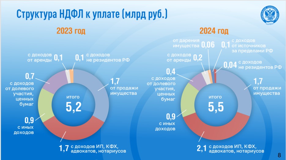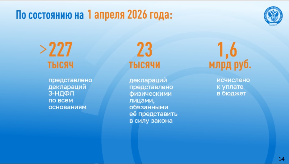 По состоянию на 1 апреля 2026 года уже представлено 227 тыс. деклараций по форме 3-НДФЛ. Из них 23 тыс. деклараций подали физические лица, которые обязаны отчитываться в силу закона. Исчислено к уплате в бюджет 1,6 млрд рублей.