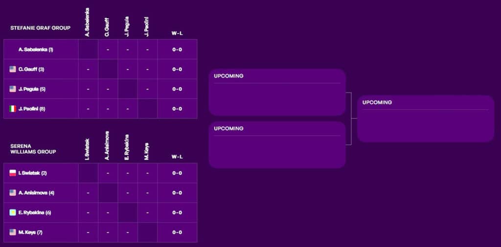 Согласно жеребьевке Итогового турнира года WTA, Елена Рыбакина (6) попала в группу Серены Уильямс. За выход в полуфинал первая ракетка Казахстана поспорит с Игой Свентек (2) из Польши, а также американками Амандой Анисимовой (4) и Мэдисон Киз (7).