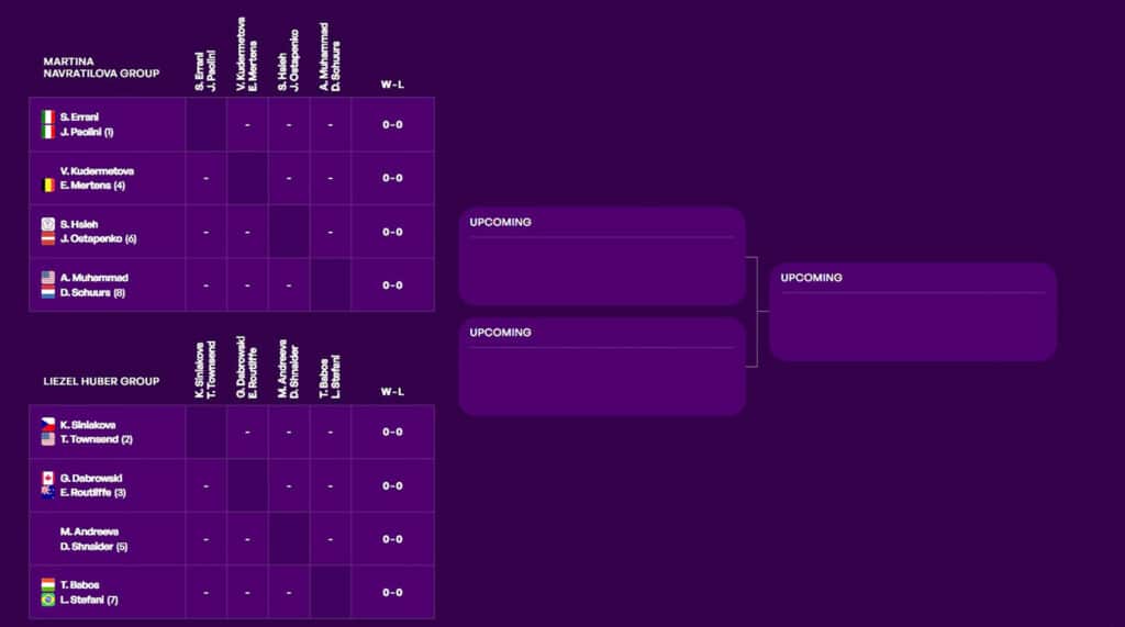 Согласно формуле турнира, в группе теннисистки или пары сыграют по круговой системе. По две лучшие выйдут в полуфинал.