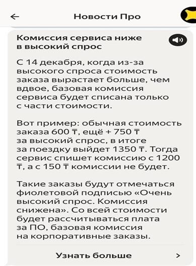 - во-первых, для водителей одним из условий повышения уровня дохода станет отмена с 14 декабря взыскания комиссии "Яндекса", если заказ превышает двукратно базовую стоимость поездки (экономический эффект примерно на 2 млрд тенге в год);